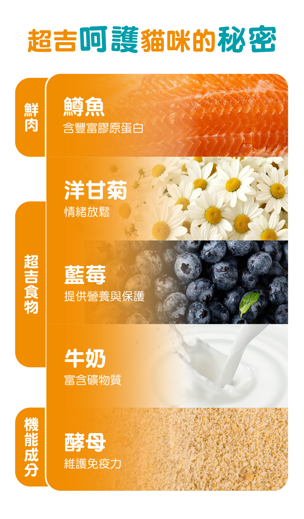 新鮮魚肉80%(鱒魚14%),乾燥魚肉(鮭魚和鱒魚),水解魚肉蛋白(鮭魚),纖維素粉,酵母產品(1%),乾燥藍莓(1%,相當於8.3%新鮮藍莓),礦物質。